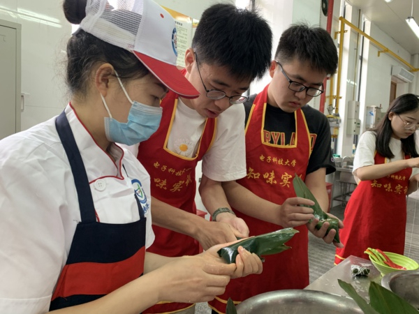 电子科技大学后勤保障部饮食服务中心支部党员手把手教同学们包粽子,从裹粽叶到包糯米再到绕线打结,让同学们动手实践,感受传统文化的魅力和劳动的乐趣。同学们开学地表示,自己在家从来没包过粽子,今天一定要和亲手包的第一个粽子合个影。