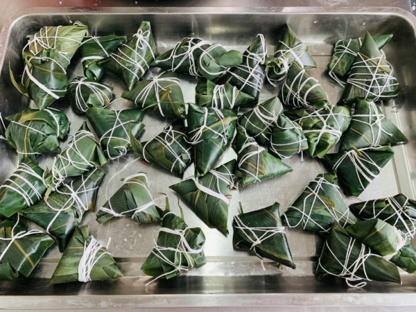 “先将粽叶卷成漏斗状,放蜜枣、填糯米,用上面的叶子将糯米盖好,再用绳将粽子捆起来就行了。”同学们都是第一次包粽子,食堂阿姨一边示范,一边讲解包粽子的小窍门,阿姨娴熟的技巧引得同学们连连称赞。大家跟随阿姨的教学,将粽叶折成圆锥状,装入糯米,合上粽叶,用线绳捆实。在包粽子过程中同学们还相互讨论,相互指点。