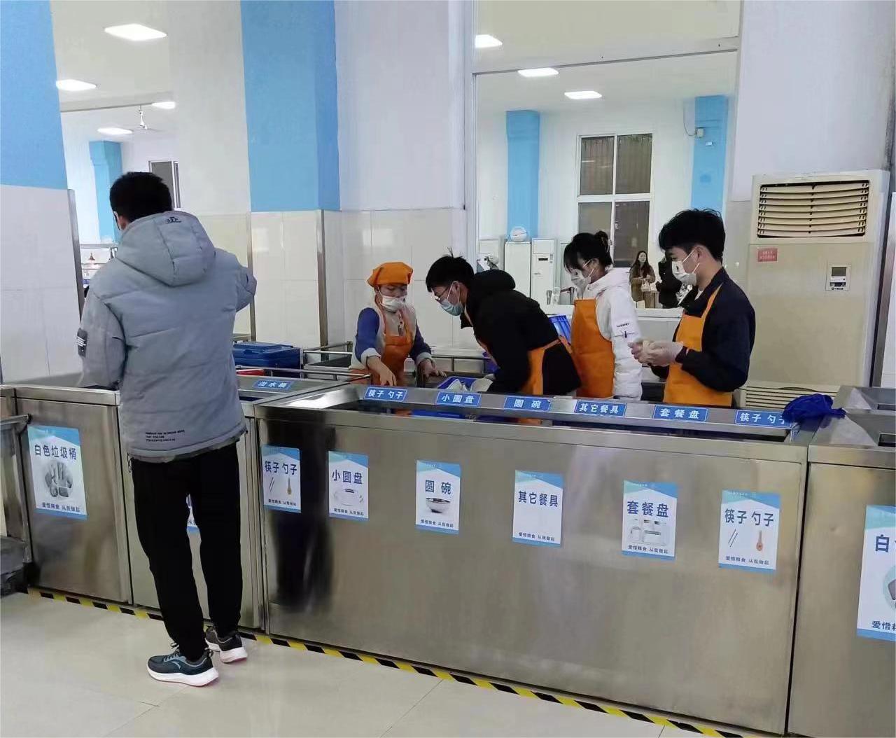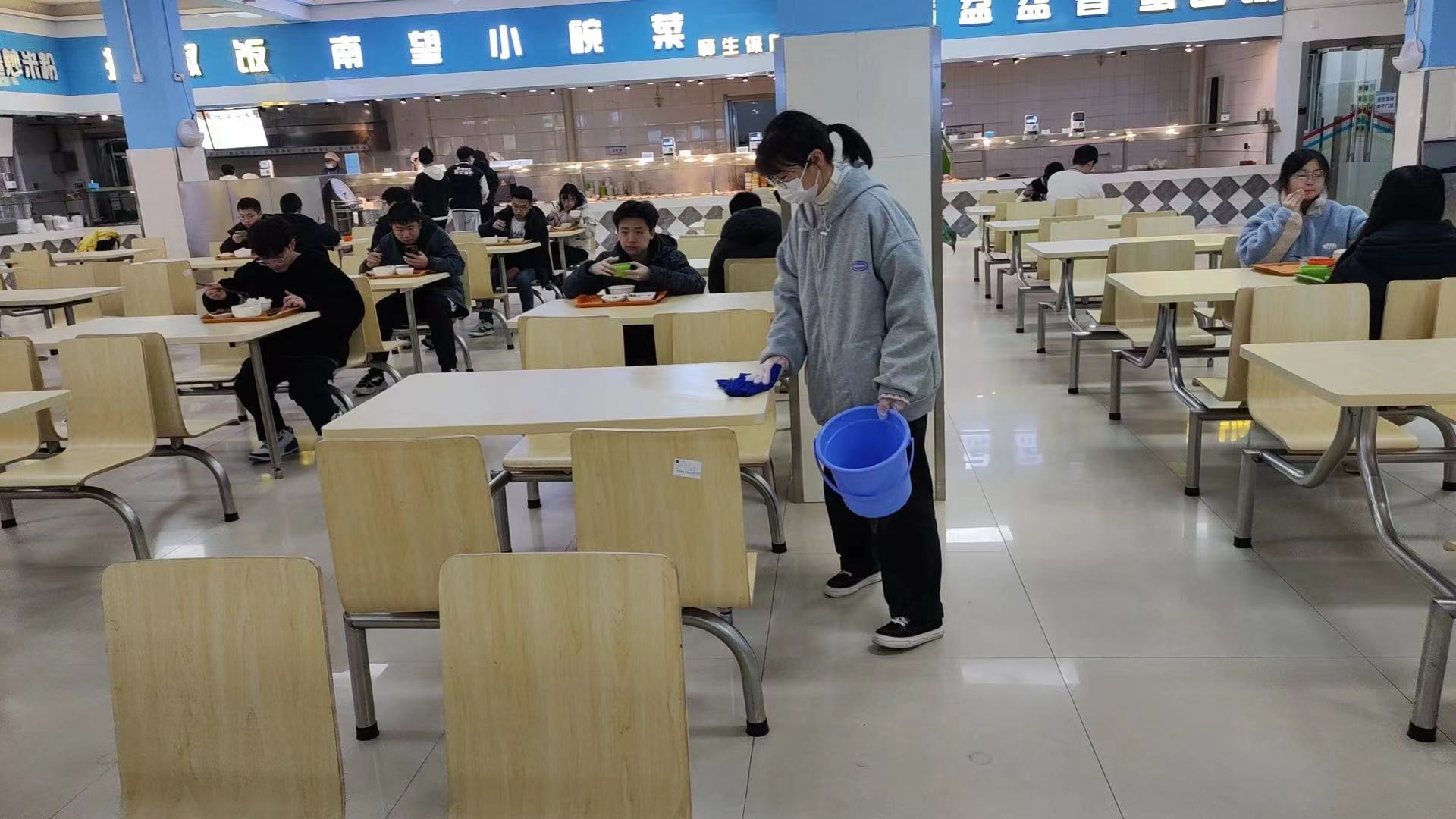 随后,志愿者们在食堂阿姨的帮助下,拿起劳动工具,迅速进入角色。他们有在餐具回收处收餐的,有在大厅擦拭桌椅、清理地面的……大家不怕苦、不怕累,忙得不亦乐乎,尽心尽力满足师生用餐需求。