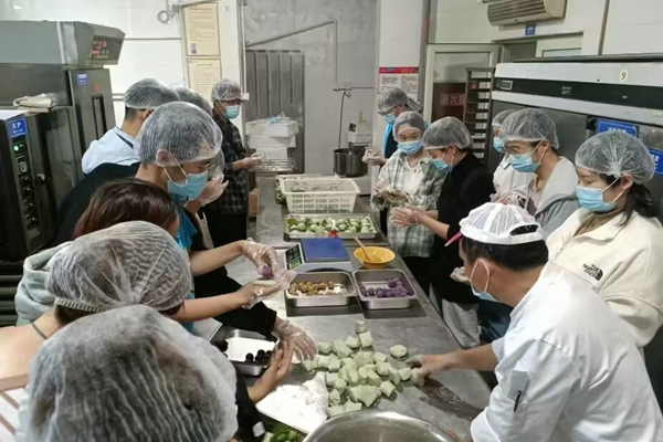 《随园食单》中记载:“捣青草为汁,和粉作团,色如碧玉。”活动一开始,同学们都摩拳擦掌,在餐厅师傅的指导下,认真观摩、学习,跟着师傅一起,捣汁、和馅儿、揉面团……大火蒸煮出艾草的清香味,大家共同品尝劳动成果,享受清爽绿意中软糯绵韧、甜而不腻的口感。