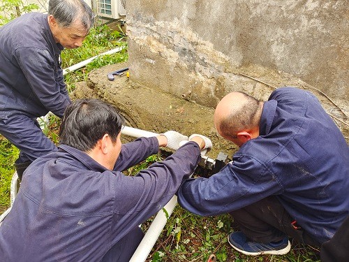经水电工对漏水处破开地面进行勘察,发现是50毫米口径供水管因年代久远,锈蚀破裂导致漏水。经现场研究,决定新装PVC管更换原管道。因时值用水高峰期,物业服务部一边应急采购管件,一边进行安装前期准备工作。为尽快恢复供水,中午12点,定海校区水电组开始抢修,首先将破裂水管与主供水管接口处换上阀门,然后再从阀门处新接PVC水管。维修中,恰逢天公不做美,天空中突然飘起细雨,为尽快恢复正常供水,水电组冒雨加班加点作业。至下午14点,历时2个小时,水电组完成水管抢修工作,保证了第二食堂及商铺的用水。据测算,如未及时对此水管进行维修,每日将浪费水300余吨。
