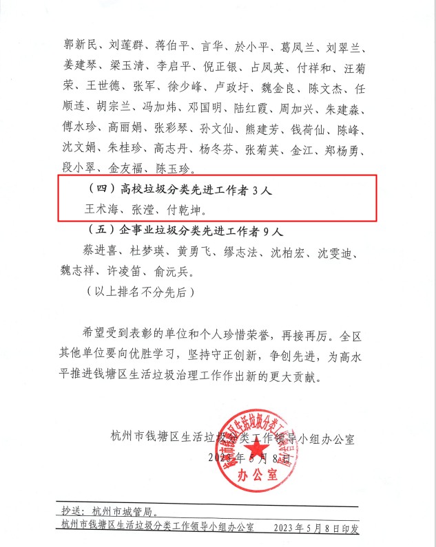 5月8日,杭州市钱塘区生活垃圾分类工作领导小组办公室发文表彰通报2022年度杭州市钱塘区生活垃圾分类区级先进集体和个人,杭州电子科技大学被授予2022年度生活垃圾分类先进高校,王术海、张滢获评高校垃圾分类先进工作者。