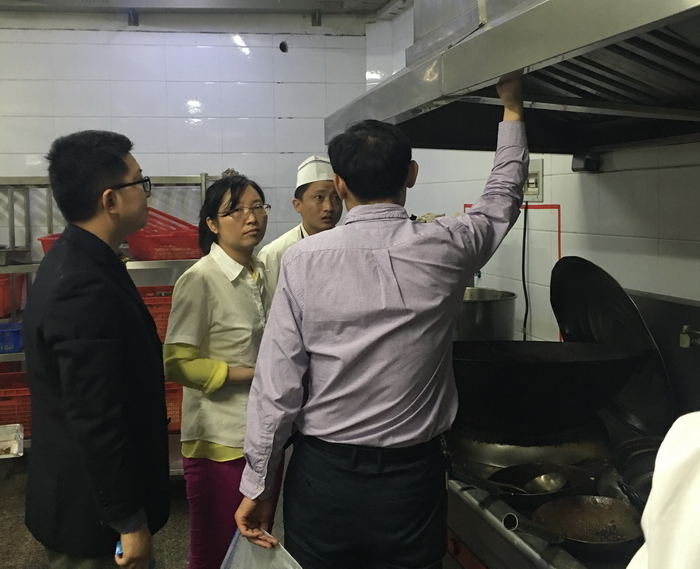 这次检查在江浦校区和新模范马路校区同时展开。检查过程中,餐饮事业部副部长邱祥国、综合办公室主任徐美燕、江浦餐饮服务中心副主任汤顺琦分别深入到各个食堂,逐个查看了集气罩、排烟风扇、灶台的油烟清洗情况,以及烟气管道、风柜的积油情况和管道密闭情况,检查了员工集体宿舍的安全用电和卫生情况,向食堂主任、合作经营项目点负责人了解了排油烟设施、灶台清洗制度及集体宿舍卫生值日制度的执行情况,并对检查发现的隐患或问题,当场提出了整改要求和进度,落实了责任人。