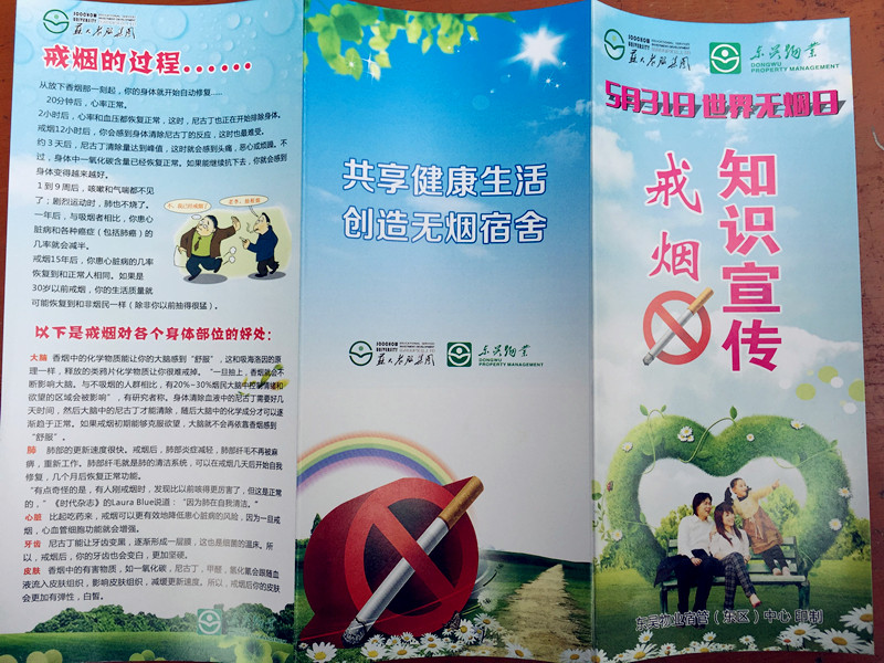 近几年,高校大学生中吸烟人群不断扩大,大学生由于缺乏对烟草危害性的认识,常常因为好奇或逞强而染上烟瘾,给健康带来很大危害。因此,在2016年5月31日——世界第29个无烟日到来之际,东吴物业宿管(东区)中心在苏州大学老校区展开了一场大规模的戒烟宣传活动。通过张贴宣传海报、发放宣传彩页、邀请学生在横幅上联名签字等一系列活动,让学生们自觉抵制烟草,珍爱生命。