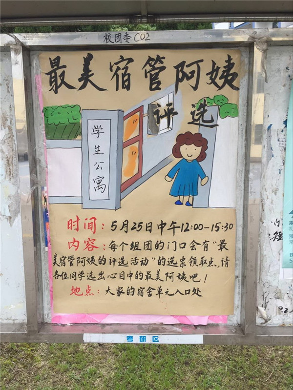 学生公寓生活是大学生学习、生活的重要场所,通过最美“宿管阿姨(大叔)”评选活动,旨在让广大同学更充分地了解宿管阿姨(大叔)可亲、可敬、可爱的一面,理解和支持学生宿舍管理和服务工作;树立优秀宿管阿姨(大叔)的先进榜样,提高宿管阿姨(大叔)的工作积极性与责任感,更好地服务广大住校大学生。