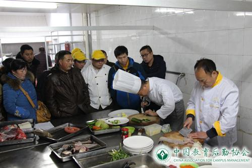 会后,大家来到长江路校区教工餐厅进行现场培训。现场,卞志敏、罗来庆两位老师向大家展示了“荷塘月色”、“麻婆豆腐”、“菊花鱼”三道精致菜肴,边讲解边演示制作要领,全程与学员们进行亲切的互动。参加培训的学员热情高涨,被两位老师精湛的厨艺深深地震撼,在认真观摩的同时情不自禁纷纷拿出手机拍照,学习氛围浓厚。