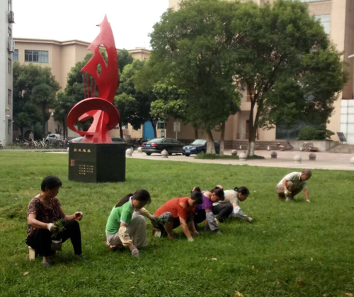 骄阳似火,热浪如涌,在这样的“桑拿天”里,多数人都躲进了空调房,但江苏科技大学的绿化养护人员在室外露天,战高温,斗酷暑,始终奋斗在第一线,抓紧对校园绿化进行药物喷洒,色块、草坪修剪,杂草拔除,抗旱灌水等养护工作。