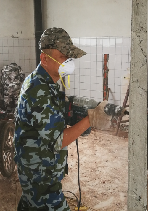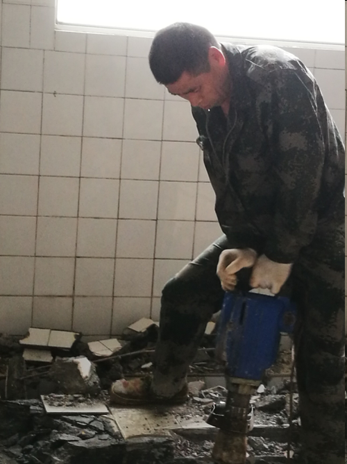由于教3厕所蹲坑水泥比较厚,拆除的工作难度和强度都强于其他地方。但是走进施工现场,立即就被施工队员们的工作热情感染,他们挥汗如雨,各工种协调配合,轮番上阵,现场电锤和冲击钻的工作声不绝于耳。施工人员佩戴手套和口罩,按用电要求规范接电,垃圾倾倒场地也有明显警示设施。在临时休息区,室内通风良好,茶水供应充足,有效避免中暑。