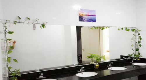 公司在厦门大学翔安校区公厕文化布置因地制宜,匠心独特,文化萦绕,焕然一新,墙壁、洗手台、厕所间窗台上插植、摆放着白蝴蝶、铜钱草、绿萝、睡莲等既漂亮又净化空气的绿色植物,墙壁四周挂置着出自师生投稿的校园美景壁画,处处充满着浓厚的绿植、校园文化气息。为了高标准的打造好公厕文化,南强物业公司发动员工人人动手,参与“能工巧匠从我做起”的水培植物培植活动,用亲手培植的“绿色精灵”把空间装点得一片生机盎然。