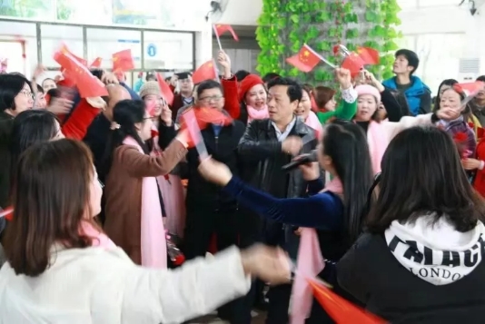 午餐期间,《茉莉花》的音乐突然响起,一群女职工身披象征着全球乳腺癌防治活动的粉红丝带,优雅地闪出人群,边唱边为身边的女职工送上一支支康乃馨,表达美好的祝福,场面温馨而喜悦。随后,伴随着《我和我的祖国》激情的旋律,在食堂就餐的全体职工自发地齐声高唱,祝福伟大的祖国繁荣富强,祝愿南华大学越来越好。