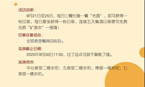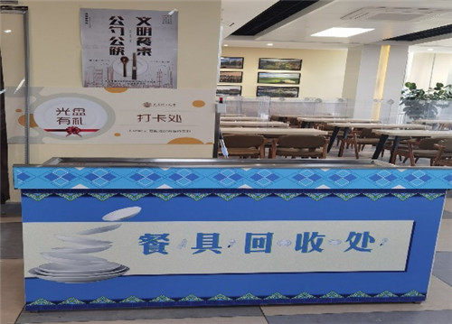 后勤饮食服务中心在各食堂全面、深入、持续推进光盘行动,开展了“光盘有礼”活动。就餐高峰时间段,在人流量较大的食堂为前来就餐的师生发放“光盘有礼”卡片,每日三餐任意一餐“光盘”,即可在“光盘有礼”打卡处获得一枚印章,每日最多获得一枚印章,连续五天集满印章便可获赠饮品一瓶。通过建立奖励机制,引导师生们减少“舌尖上的浪费”。