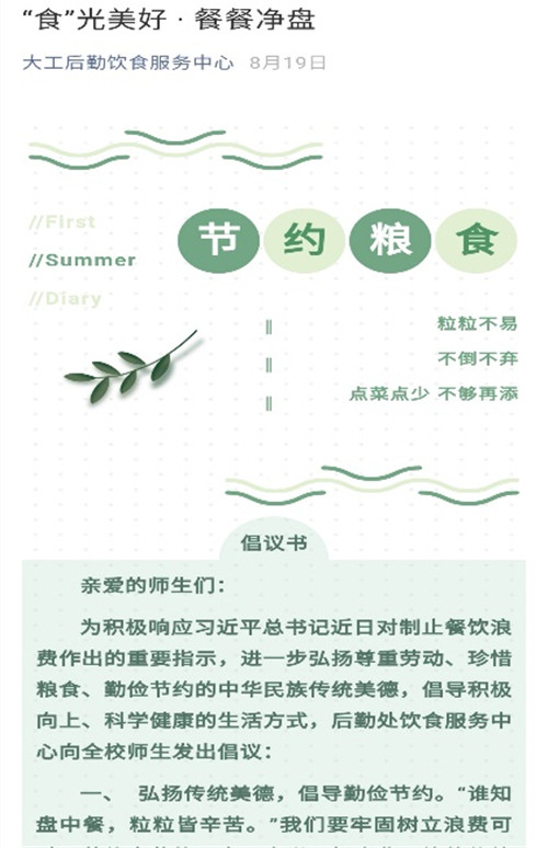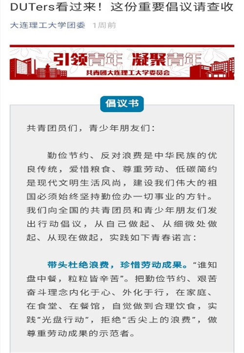 校团委和后勤饮食服务中心充分利用微信公众平台,向全校师生发出倡议,倡导师生们要牢固树立浪费可耻、节约光荣的理念,自觉弘扬中华民族的传统美德;倡导师生们树立理性观念,力戒过度消费、奢侈浪费;要让节约粮食成为人人自觉的行动,让每个人成为节约粮食的坚定践行者、宣传者、监督者,在全校范围内营造勤俭节约的良好氛围。
