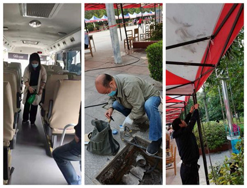 加大“消杀”力度。特种设备维修与通讯服务中心负责四个迎新站点的首发车辆消杀工作。