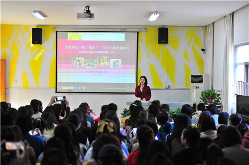 校本部幼儿园园长姜英以“教育引领一路‘指南’,守正出新幸福前行”为主题,向大家介绍了幼儿园办园宗旨、办园理念、团队建设及特色课程等方面内容,全面细致地展示了幼儿园欣欣向荣的发展面貌,赢得了在场老师们频频称赞。