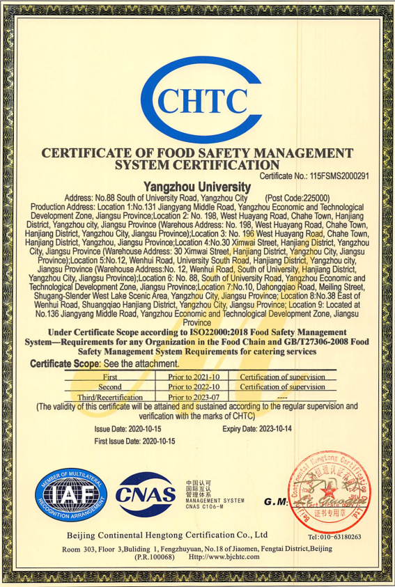 近日,扬州大学顺利通过ISO22000:2018食品安全管理体系/HACCP体系认证并取得证书,成为全省首家大学生和幼儿食堂全覆盖通过该认证的校园餐饮单位。