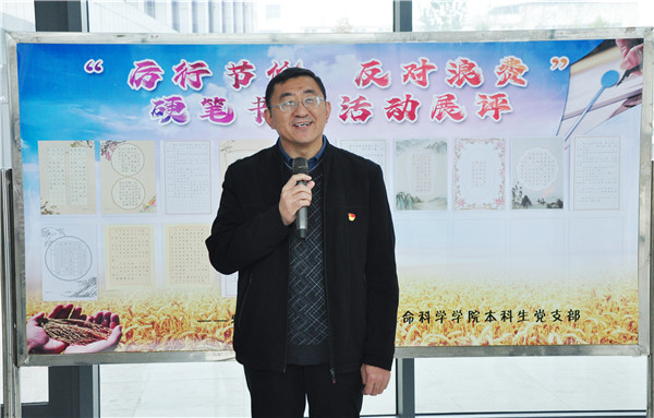 评选前,生命科学学院党总支书记郭万保发表讲话,他说,汉字是中华文明的载体,以书写的方式举办此次“厉行节约 反对浪费”主题的硬笔书法活动,既是重温传统文化,也是贯彻习近平总书记关于制止餐饮浪费行为的重要指示精神,同时也加深了党员之间的合作交流,希望两个支部能够积极展开密切的协作,把支部共建的各项工作推向深入,不断拓展合作的平台和内容,使以后的活动能够达成更良好的效果,最后预祝活动圆满成功。