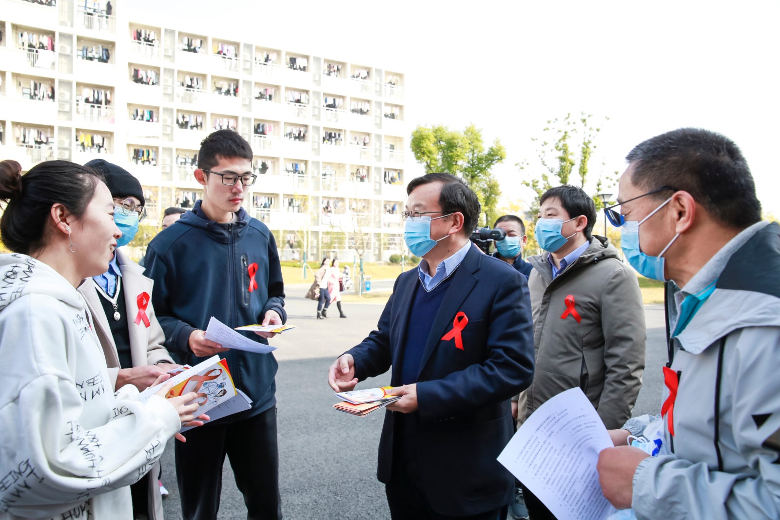 学校领导高度重视艾滋病防治工作,校长周南平、学生处处长蒋春雷、团委书记薛泉祥、后勤管理处处长后勤集团总经理胡爱祥、副处长朱向运、校医院院长罗文虎等领导以及镇江市疾控中心工作人员,在现场和志愿者一同发放防艾知识竞答问卷和宣传册。周南平校长特别关心青年大学生的健康成长,亲自叮嘱大学生在校期间不仅要学好专业知识、也要重视注重预防各类疾病,艾滋病目前在高校的发病率呈上升态势,形式严峻,不容忽视,艾滋病就在我们身边,要增强艾滋病预防意识和能力,鼓励大学生要积极参与到艾滋病和新冠肺炎疫情的防治工作中,结合新冠肺炎疫情,提高大学生对艾滋病的认识和重视程度。
