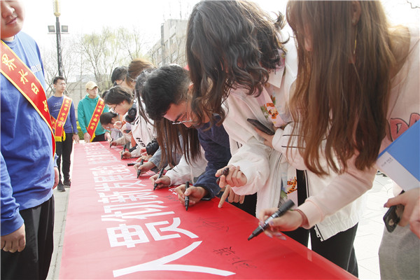 活动结束后,在场师生踊跃到签名条幅上进行签名,然后到展示区进行有关节水知识的有奖答题活动。